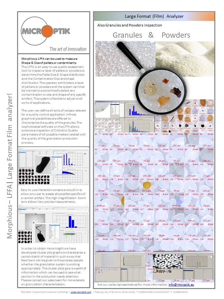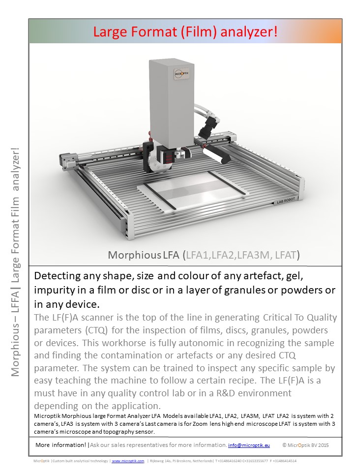 The LFA scanner is the top of the line in generating Critical To Quality parameters (CTQ) for the inspection of films, discs, granules, powders or devices. This workhorse is fully autonomic in recognizing the sample and finding the contamination or artifacts or any desired CTQ parameter. The system can be trained to inspect any specific sample by easy teaching the machine to follow a certain recipe. The LFA is a must have in any quality control lab or in a R&D environment depending on the application.
