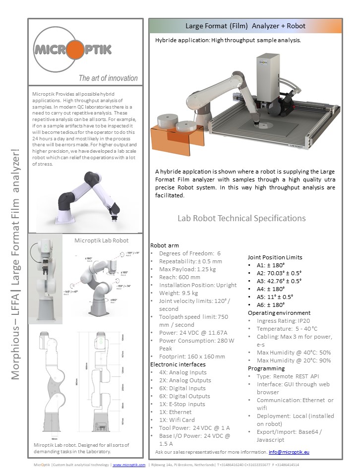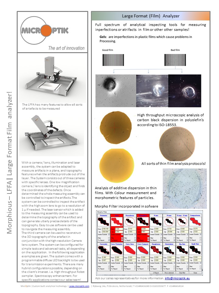 Microptik Morphious large Format Analyzer LFA Models available LFA1, LFA2, LFA3M, LFAT LFA2 is system with 2 camera’s, LFA3 is system with 3 camera’s Last camera is for Zoom lens high end microscope LFAT is system with 3 camera’s microscope and topography sensor.
